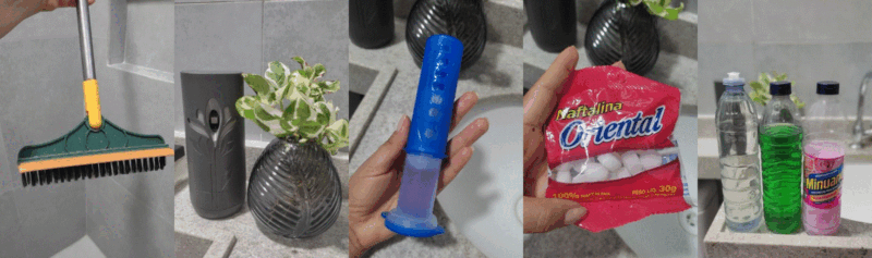 Eu costumo manter três frascos atrás da bacia sanitária: um com água sanitária, um com desinfetante e um com sabão líquido. Todos os dias, logo pela manhã, jogo água sanitária na bacia e deixo agir por 5 minutos. Depois, aplico o sabão líquido, esfrego com a vassourinha e dou descarga. Ao longo do dia, sempre que a bacia for usada para o número 2, repito o processo. Além disso, logo após o meu primeiro banho, espalho um pouco de água sanitária e sabão líquido no chão do box, esfrego com a vassoura e enxáguo rapidamente com a água do chuveiro. Dessa forma, consigo manter tudo sempre fresco e livre de sujeira acumulada.