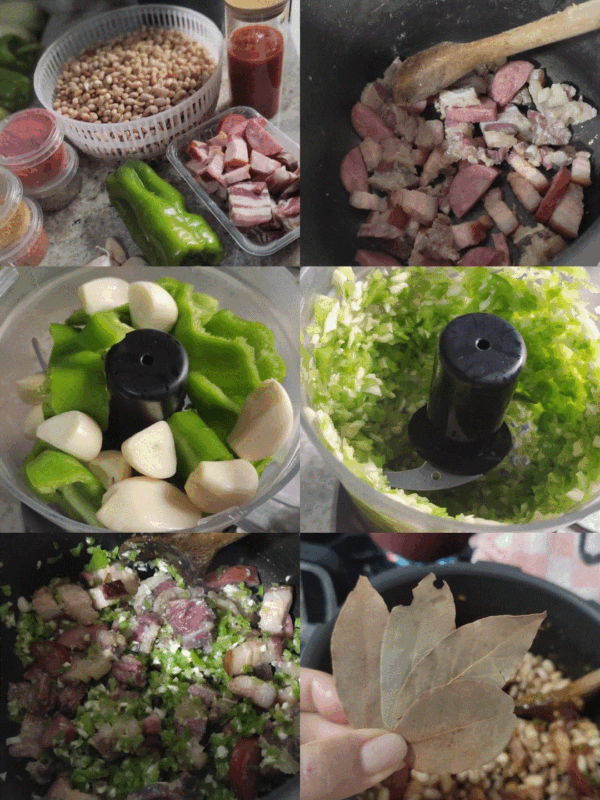 Em seguida, na panela de pressão, frite o bacon, a calabresa e a carne de sertão cortados em cubos pequenos, usando a própria gordura. Quando estiverem douradinhos, triture no processador o pimentão com os dentes de alho descascados e despeje essa mistura na panela. Então, mexa bem até soltar toda a caramelização do fundo.