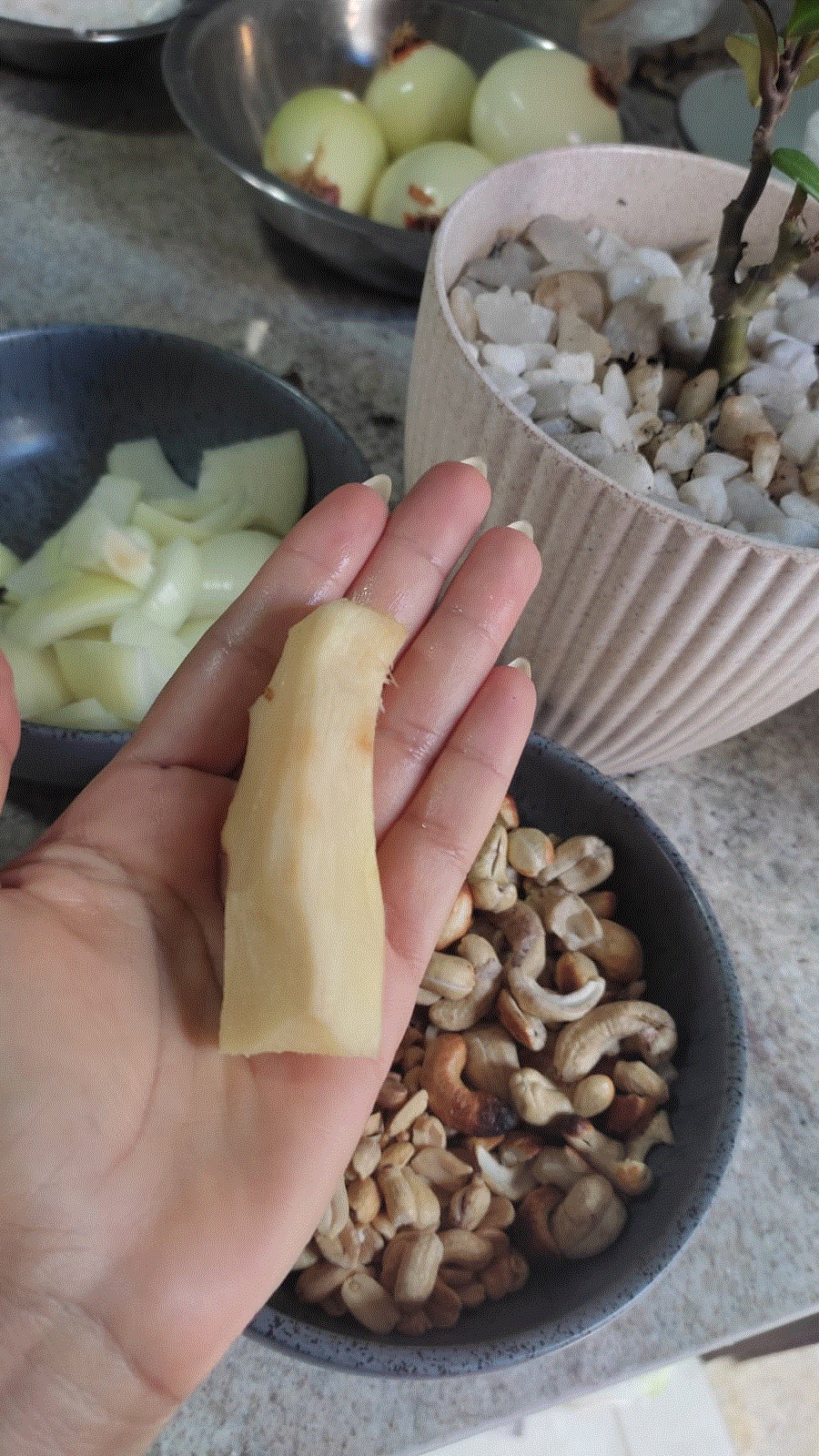 - Em seguida, leve essa mistura para o liquidificador. Adicione também a cebola cortada grosseiramente, o coentro, o amendoim, a castanha, o camarão seco (ou o substituto), o gengibre e o sal.